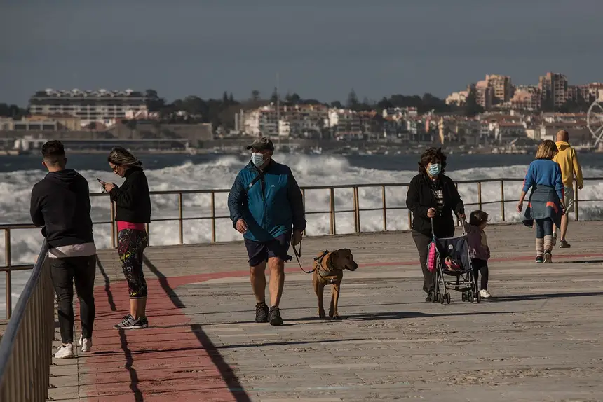 “Que dia lindo”, ouve-se a sair dos lábios escondidos pela máscara de uma mulher que passava. O dia está bonito, sim, mas o sotaque brasileiro, talvez carioca, faz lembrar uma qualquer imagem do calçadão do Rio de Janeiro e é preciso ajustar as expectativas. Falta calor. Na Praia da Poça, em São João do Estoril, o sol era suficiente para uns 15 graus centígrados, apesar da brisa fresca. O Paredão de Cascais, encerrado desde 17 de janeiro por receber a visita de demasiada gente num fim de semana já durante o confinamento, foi reaberto pela autarquia às 18h de terça-feira. Esta quarta-feira viu-se a afluência do costume, com mais ou menos cuidados.