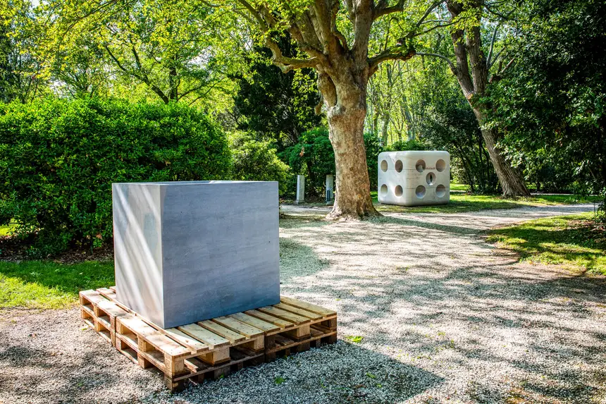 No jardim da Fondazione Giorgio Cini, na ilha de San Giorgio Maggiore, em Veneza, os dois cubos não distam muito um do outro. De um lado, “Dice (Limestone)”, de Carsten Höller, permite uma interação física com uma reprodução, de grande formato, de um dado de jogo oco, à semelhança do que o artista alemão tem feito com outros materiais. Do outro, a visão sobre o verde é interrompida por uma escultura, de pedra e madeira (paletes), “Azul Cadoiço”, de Julião Sarmento, que cruza o cinzeiro de Bruno Munari com o cubo minimalista de Donald Judd. O facto de as duas peças serem cubos é uma coincidência, como o Expresso descobrirá, semanas mais tarde, em Lisboa, em conversa com os artistas. Serem de mármore já não.