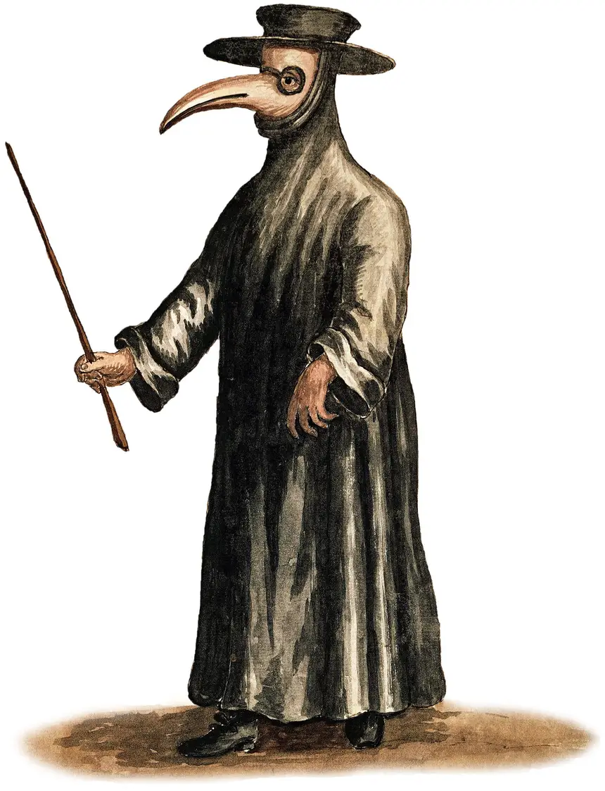 Para lidarem com os infetados, os médicos usavam uma vestimenta em couro, onde a parte superior terminava num bico longo de pássaro