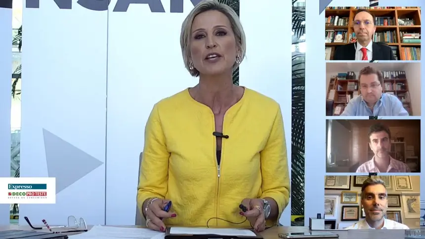 Marta Atalaya (SIC Notícias) moderou um debate que contou com (de cima para baixo) João Duque, economista e professor catedrático no ISEG; Joaquim Miranda Sarmento, professor no ISEG; Ricardo Pais Mamede, professor no ISCTE e; Pedro Lino, CEO da Optimize