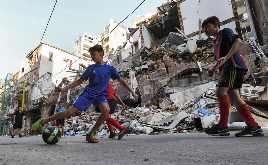 Futebol de rua em Beirute por entre a destruição causada pelas explosões no porto, que devastaram parte da capital do Líbano, a 4 de agosto