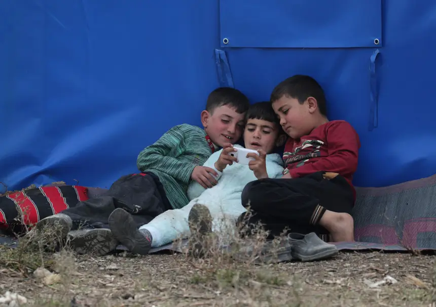 Crianças refugiadas brincam com um telemóvel em Azaz, na Síria