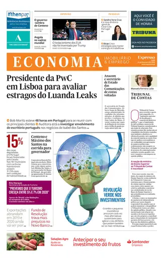 Luanda Leaks O caderno de Economia faz manchete com a visita do presidente mundial da PWC a Portugal. Bob Moritz, decidiu vir a Lisboa há duas semanas para perceber até que ponto é que a reputação da auditora ficou manchada pelo envolvimento do escritório português com a cliente angolana Isabel dos Santos, arguida em Angola e acusada pelo Governo de João Lourenço de desvio de dinheiro público.