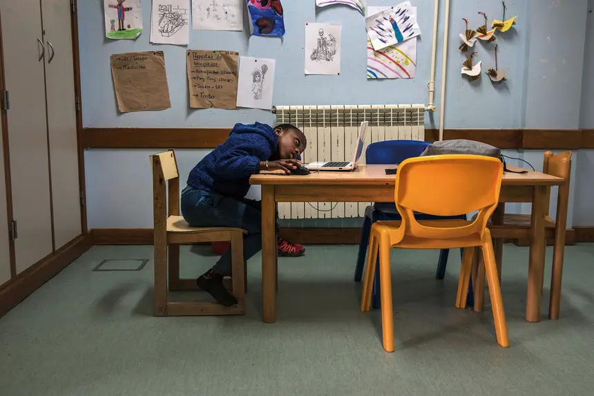 Às duas da tarde, na Escola Básica de Trajouce (Cascais) não há correrias, gritos e risos de crianças pelos pátios, salas e corredores. O silêncio é quase total. É preciso chegar à sala de expressões artísticas para ouvir as conversas soltas entre três rapazes, o Marinho e o Yusson, ambos de seis anos, e o Jaílson, de sete. Estão às voltas com os portáteis cedidos pelo Ministério da Educação com a ajuda de Marcos Braz, animador naquele estabelecimento de ensino. É ali, na zona com mais rede da escola, que vão ter as aulas enquanto se mantiver o lockdown.